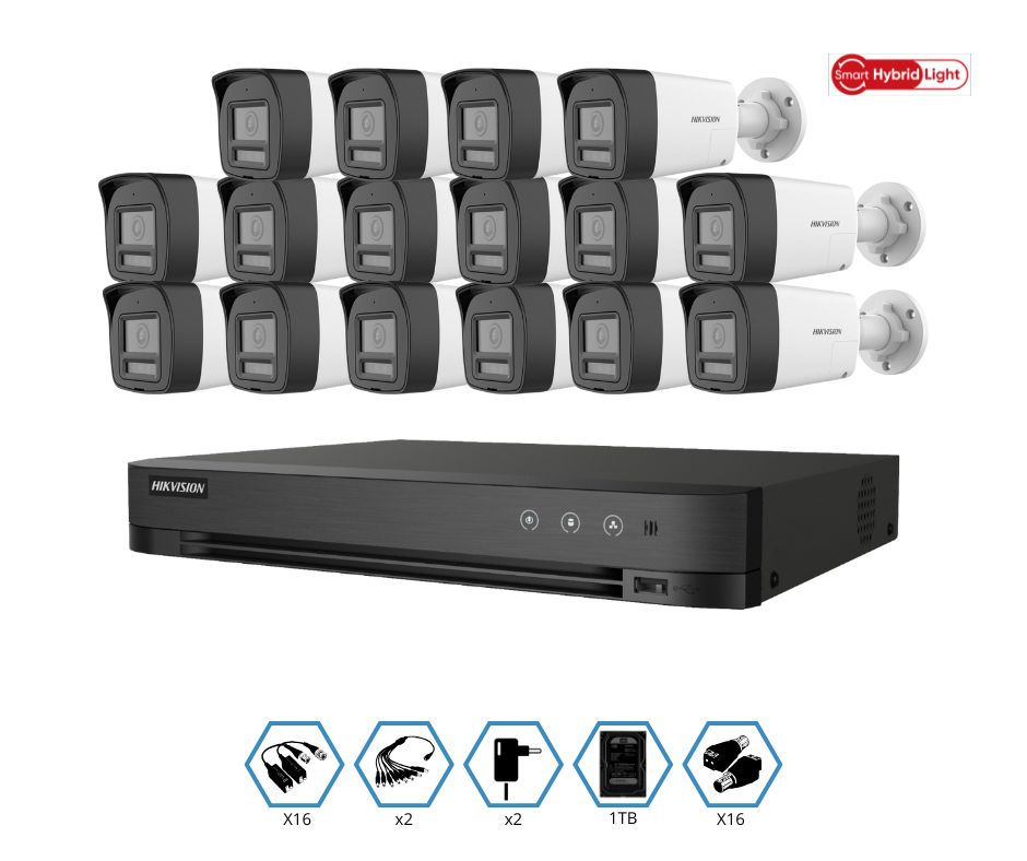KIT HIKVISION GRABADOR + 16 CAMARAS 2MP VISION NOCTURNA A COLOR CON AUDIO + DISCO 1TB COMPLETO