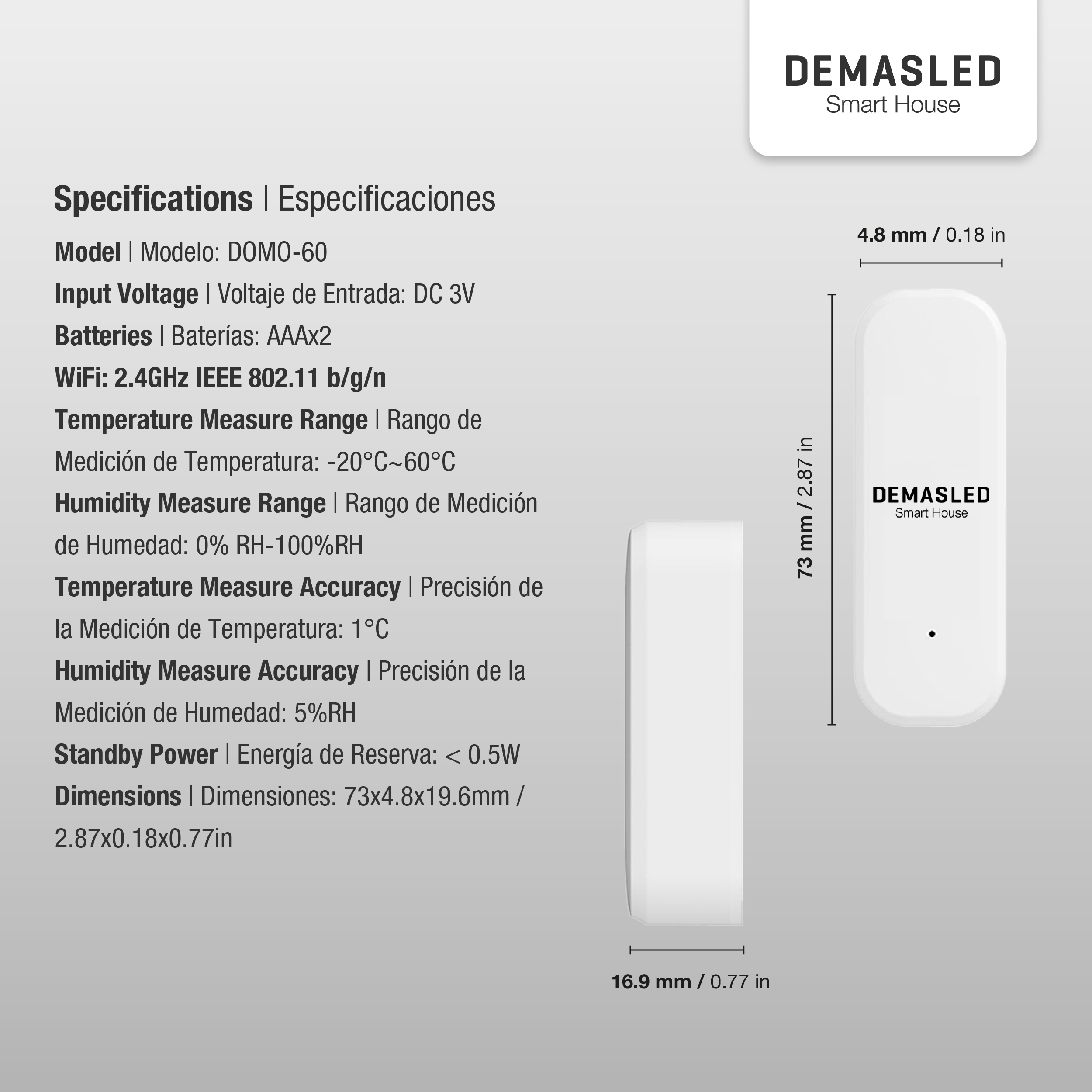 El Sensor de Temperatura y Humedad Smart WiFi de DEMASLED es un dispositivo avanzado que combina la funcionalidad de medición de temperatura y humedad con conectividad WiFi y Bluetooth. Este sensor inteligente permite monitorear y controlar las condiciones ambientales de manera remota a través de una aplicación móvil, ofreciendo conveniencia y precisión en la gestión del clima interior. Ideal para el hogar, oficinas, y otros espacios donde se requiere un control eficiente del ambiente.